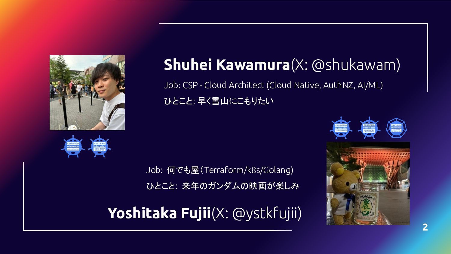 Native, AuthNZ, AI/ML) ひとこと: 早く雪山にこもりたい Yoshitaka Fujii(X: @ystkfujii) Job: 何でも屋(Terraform/k8s/Golang) ひとこと: 来年のガンダムの映画が楽しみ