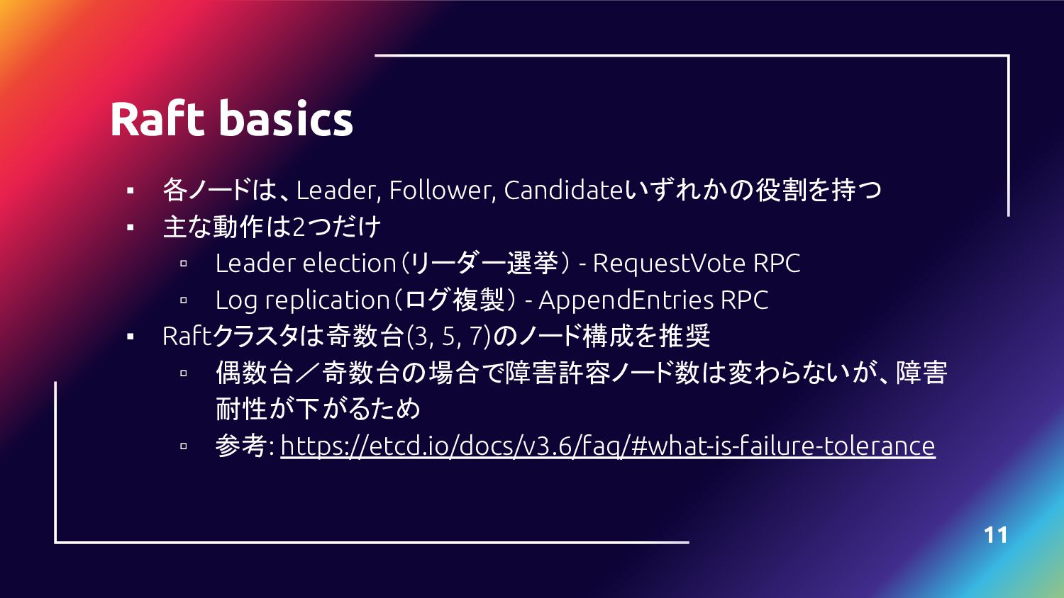 election(リーダー選挙) - RequestVote RPC ▫ Log replication(ログ複製) - AppendEntries RPC ▪ Raftクラスタは奇数台(3, 5, 7)のノード構成を推奨 ▫ 偶数台/奇数台の場合で障害許容ノード数は変わらないが、障害 耐性が下がるため ▫ 参考: https://etcd.io/docs/v3.6/faq/#what-is-failure-tolerance 11