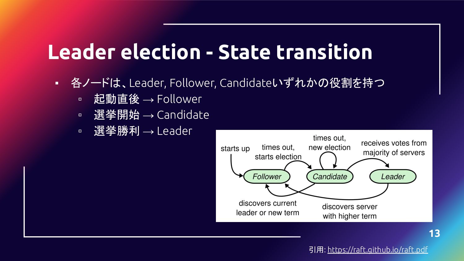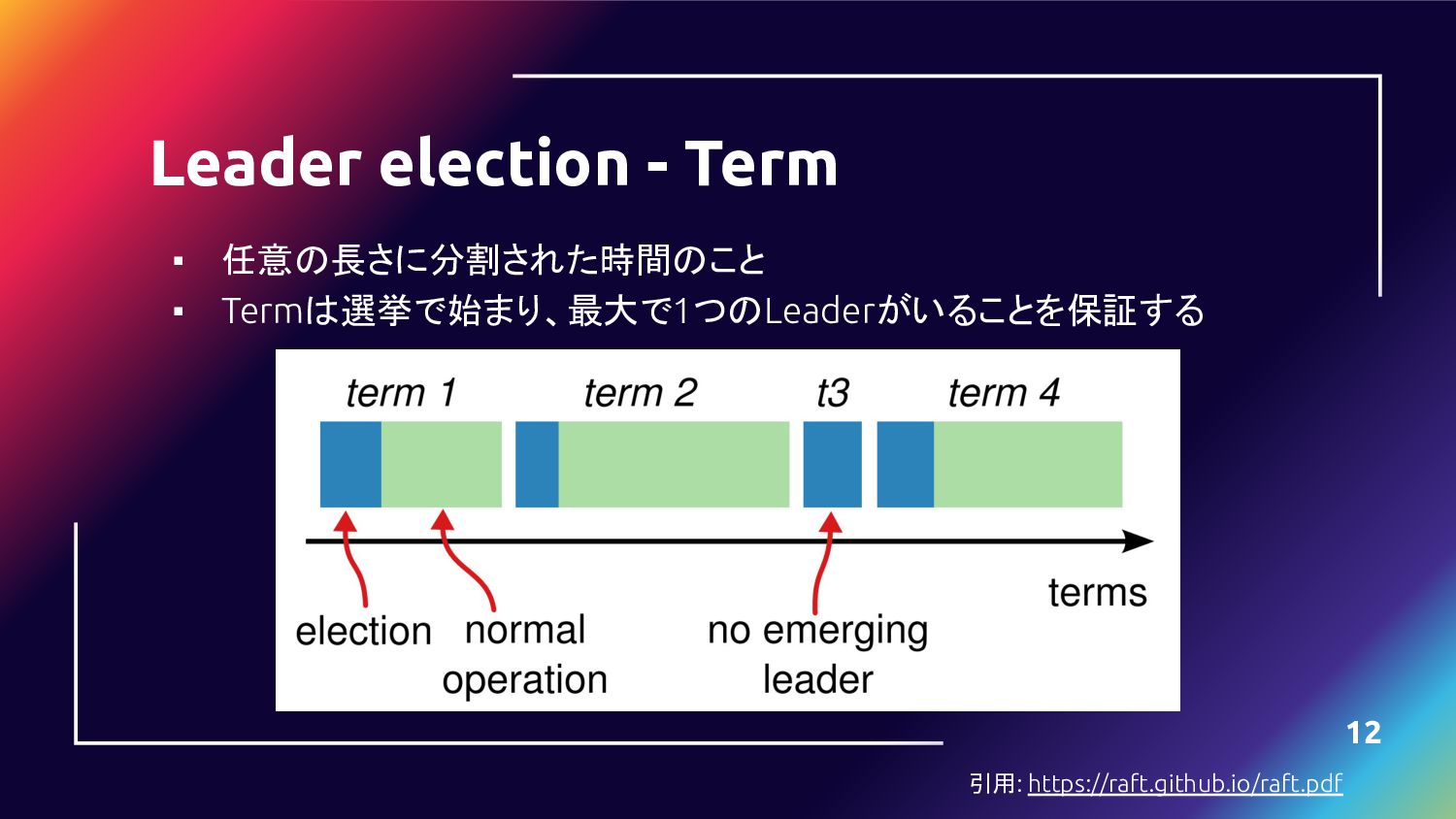 Leader election - Term ▪ 任意の長さに分割された時間のこと ▪ Termは選挙で始まり、最大で1つのLeaderがいることを保証する 12 引用: