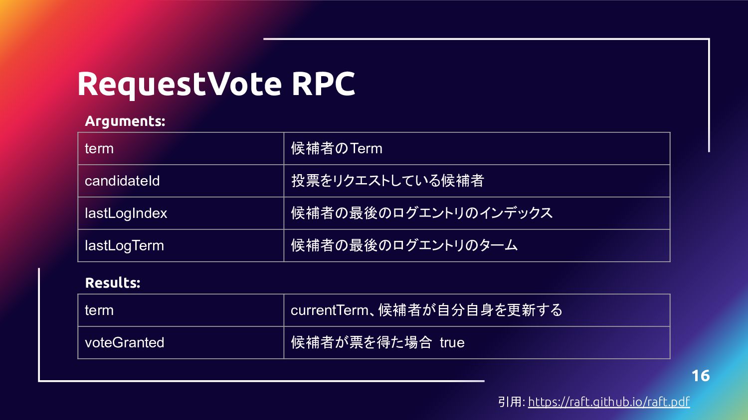 候補者の最後のログエントリのターム term currentTerm、候補者が自分自身を更新する voteGranted 候補者が票を得た場合 true Arguments: Results: 引用: https://raft.github.io/raft.pdf