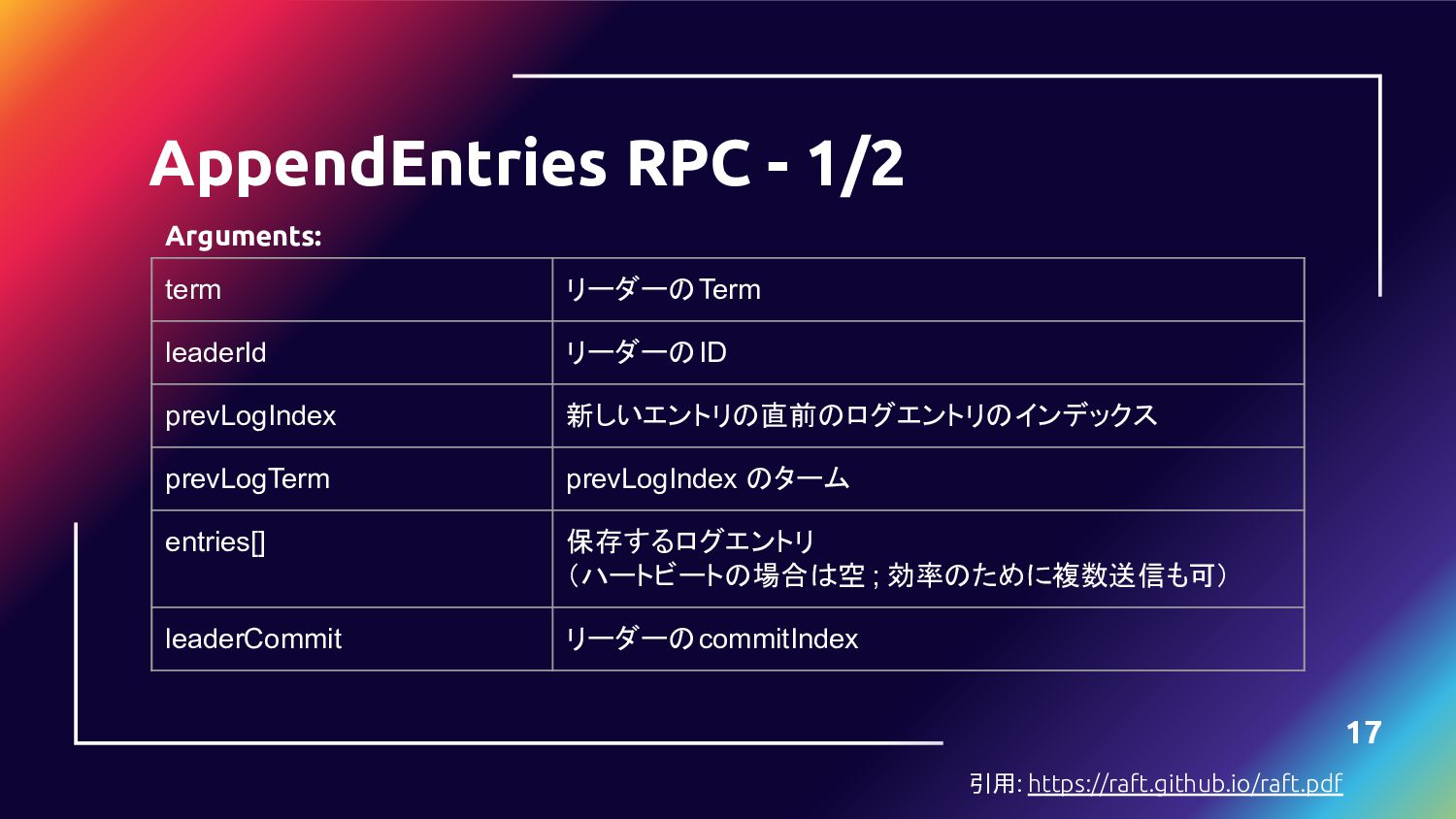 新しいエントリの直前のログエントリのインデックス prevLogTerm prevLogIndex のターム entries[] 保存するログエントリ (ハートビートの場合は空 ; 効率のために複数送信も可) leaderCommit リーダーのcommitIndex Arguments: 引用: https://raft.github.io/raft.pdf
