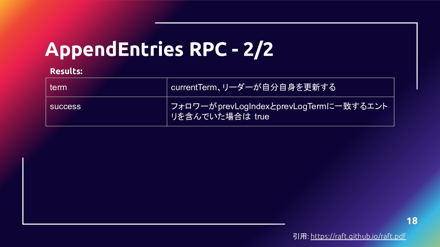 18 term currentTerm、リーダーが自分自身を更新する success フォロワーがprevLogIndexとprevLogTermに一致するエント リを含んでいた場合は true Results: AppendEntries RPC