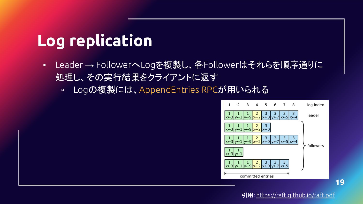 Log replication ▪ Leader → FollowerへLogを複製し、各Followerはそれらを順序通りに 処理し、その実行結果をクライアントに返す ▫ Logの複製には、AppendEntries RPCが用いられる