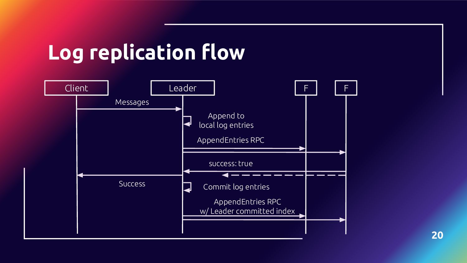 to local log entries AppendEntries RPC success: true Commit log entries AppendEntries RPC w/ Leader committed index Success