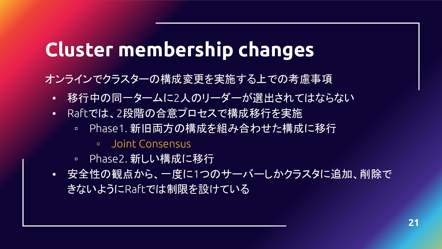 Phase1. 新旧両方の構成を組み合わせた構成に移行 ▫ Joint Consensus ▫ Phase2. 新しい構成に移行 ▪ 安全性の観点から、一度に1つのサーバーしかクラスタに追加、削除で きないようにRaftでは制限を設けている