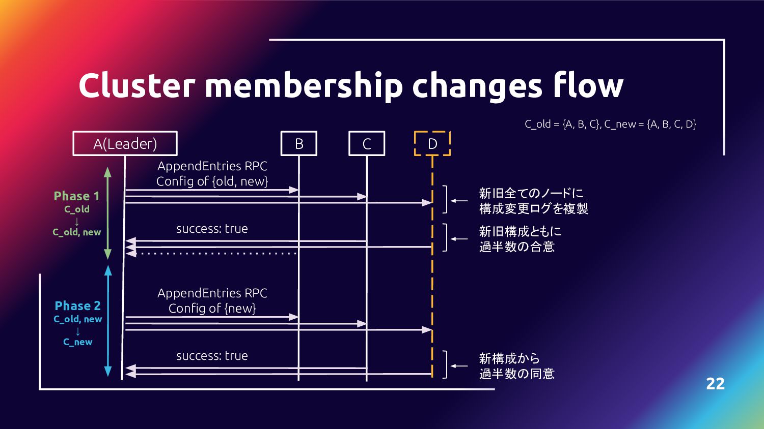 RPC Config of {old, new} success: true 新旧全てのノードに 構成変更ログを複製 新旧構成ともに 過半数の合意 AppendEntries RPC Config of {new} success: true 新構成から 過半数の同意 Phase 1 C_old ↓ C_old, new Phase 2 C_old, new ↓ C_new C_old = {A, B, C}, C_new = {A, B, C, D}