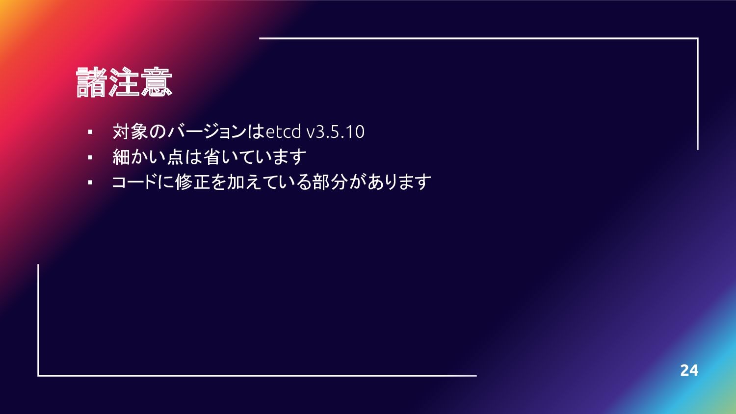 24 ▪ 対象のバージョンはetcd v3.5.10 ▪ 細かい点は省いています ▪ コードに修正を加えている部分があります 諸注意