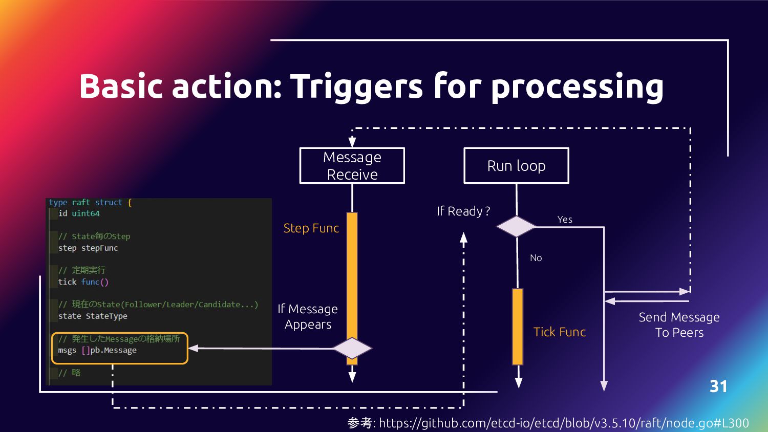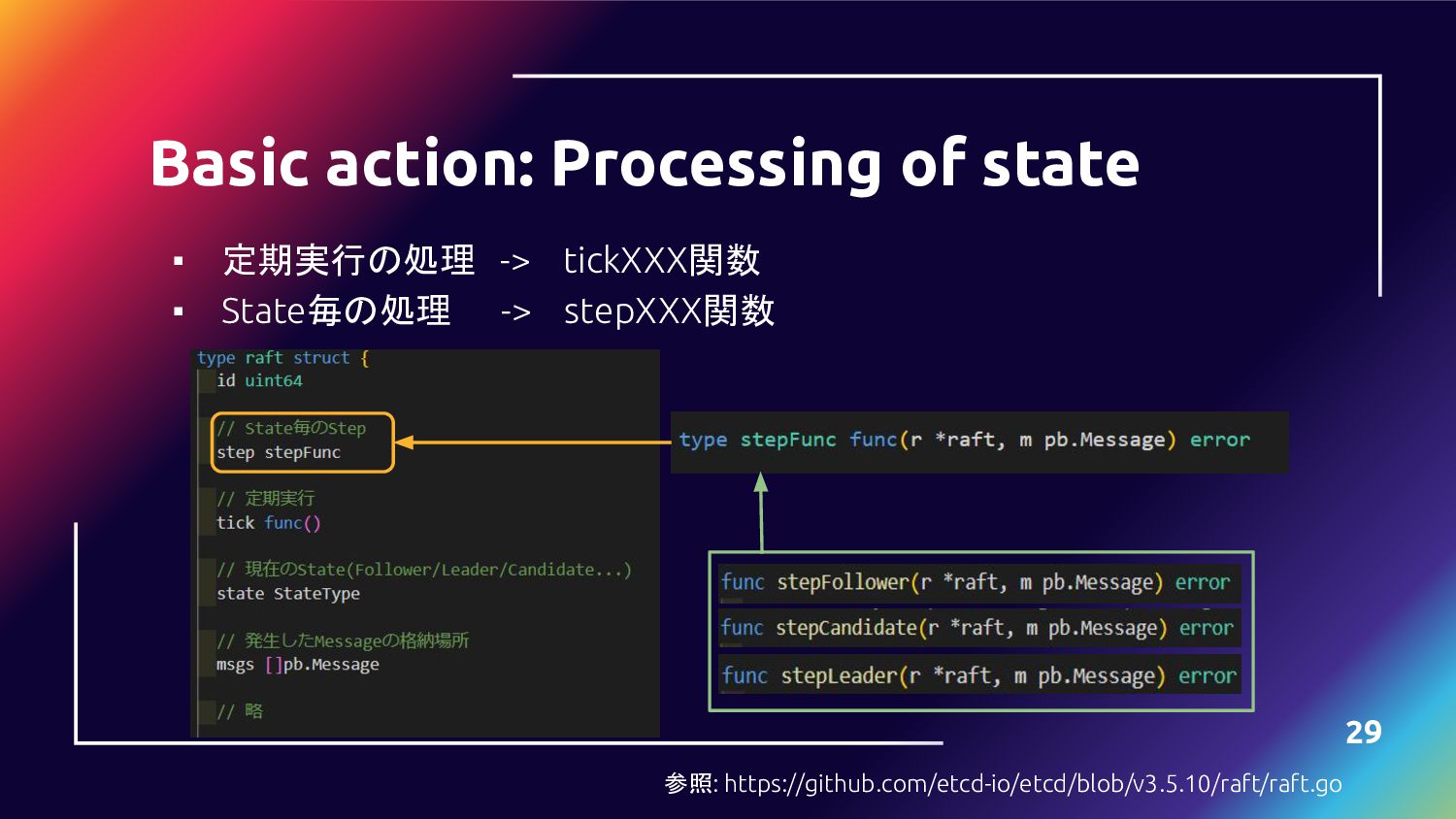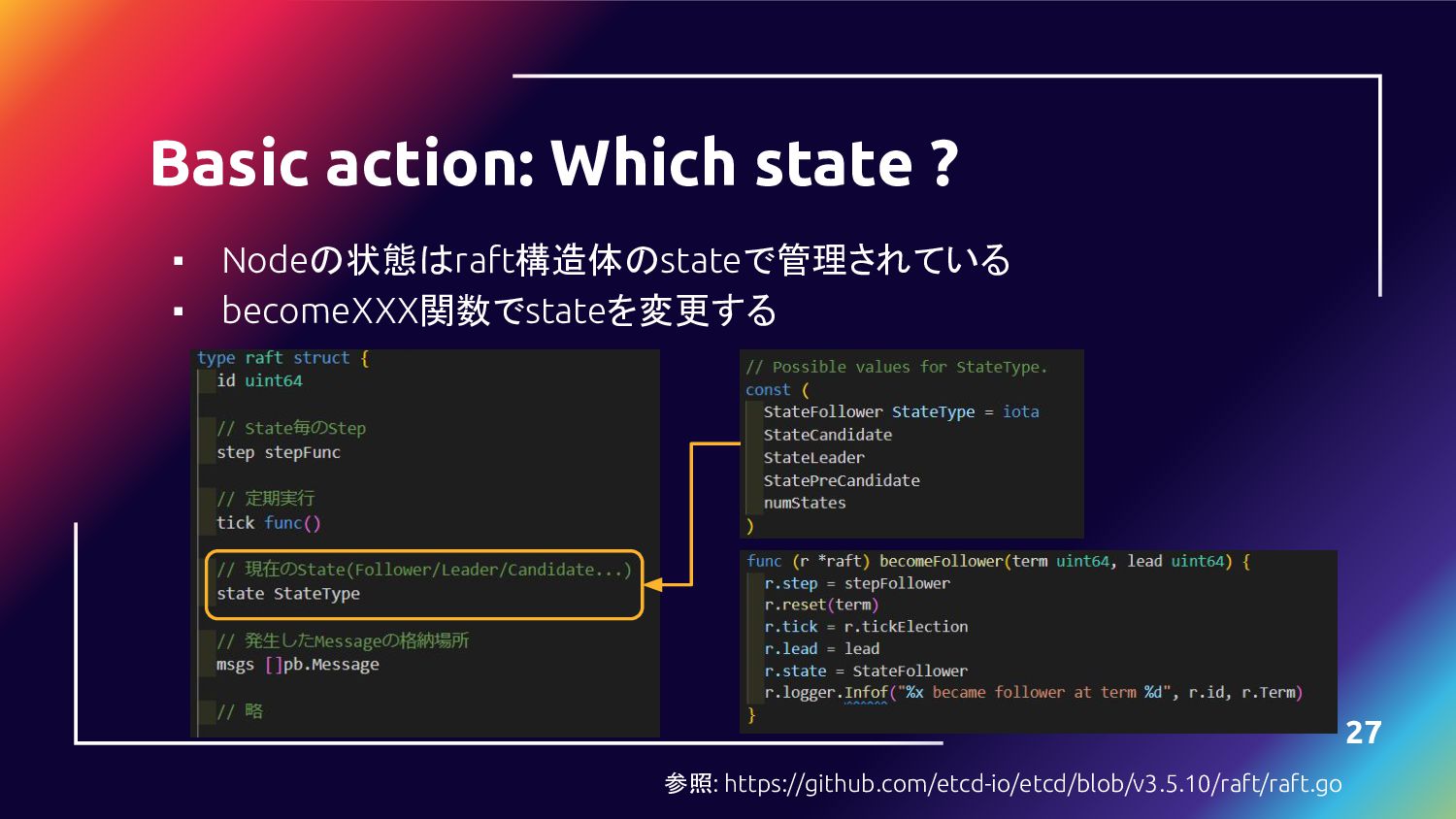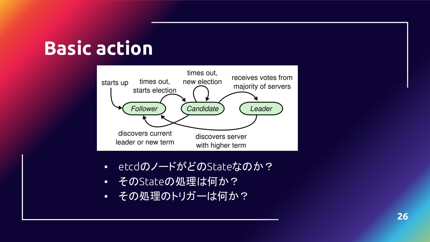 Basic action 26 ▪ etcdのノードがどのStateなのか? ▪ そのStateの処理は何か? ▪ その処理のトリガーは何か?