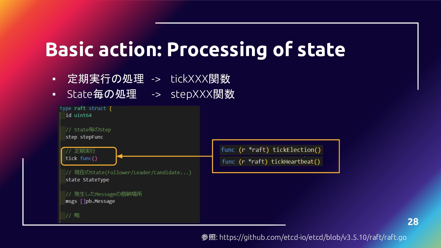 Basic action: Which state ? 27 ▪ Nodeの状態はraft構造体のstateで管理されている ▪ becomeXXX関数でstateを変更する