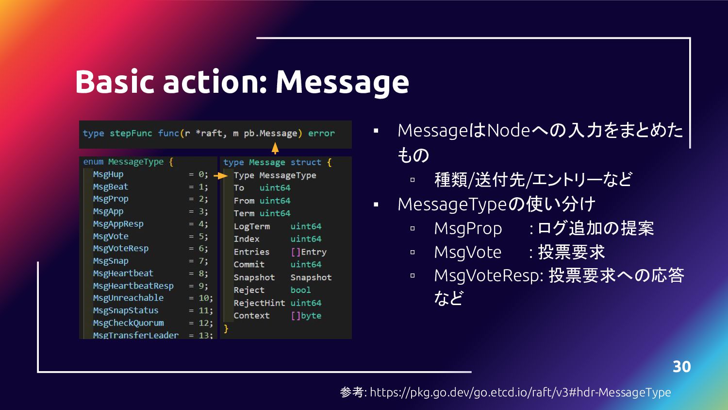MessageTypeの使い分け ▫ MsgProp : ログ追加の提案 ▫ MsgVote : 投票要求 ▫ MsgVoteResp: 投票要求への応答 など 参考: https://pkg.go.dev/go.etcd.io/raft/v3#hdr-MessageType