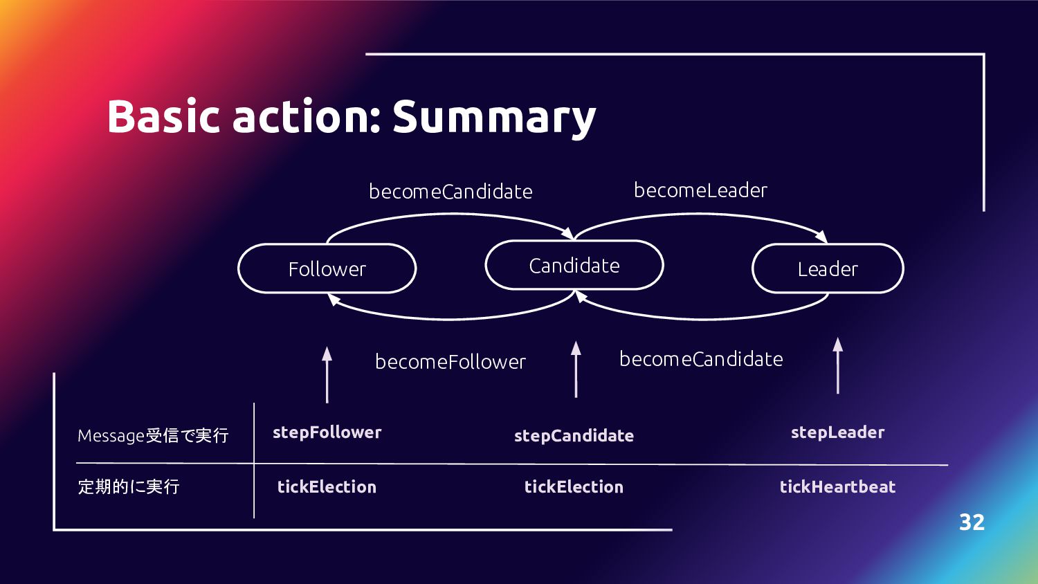 becomeCandidate stepFollower stepCandidate stepLeader tickElection tickHeartbeat tickElection 定期的に実行 Message受信で実行