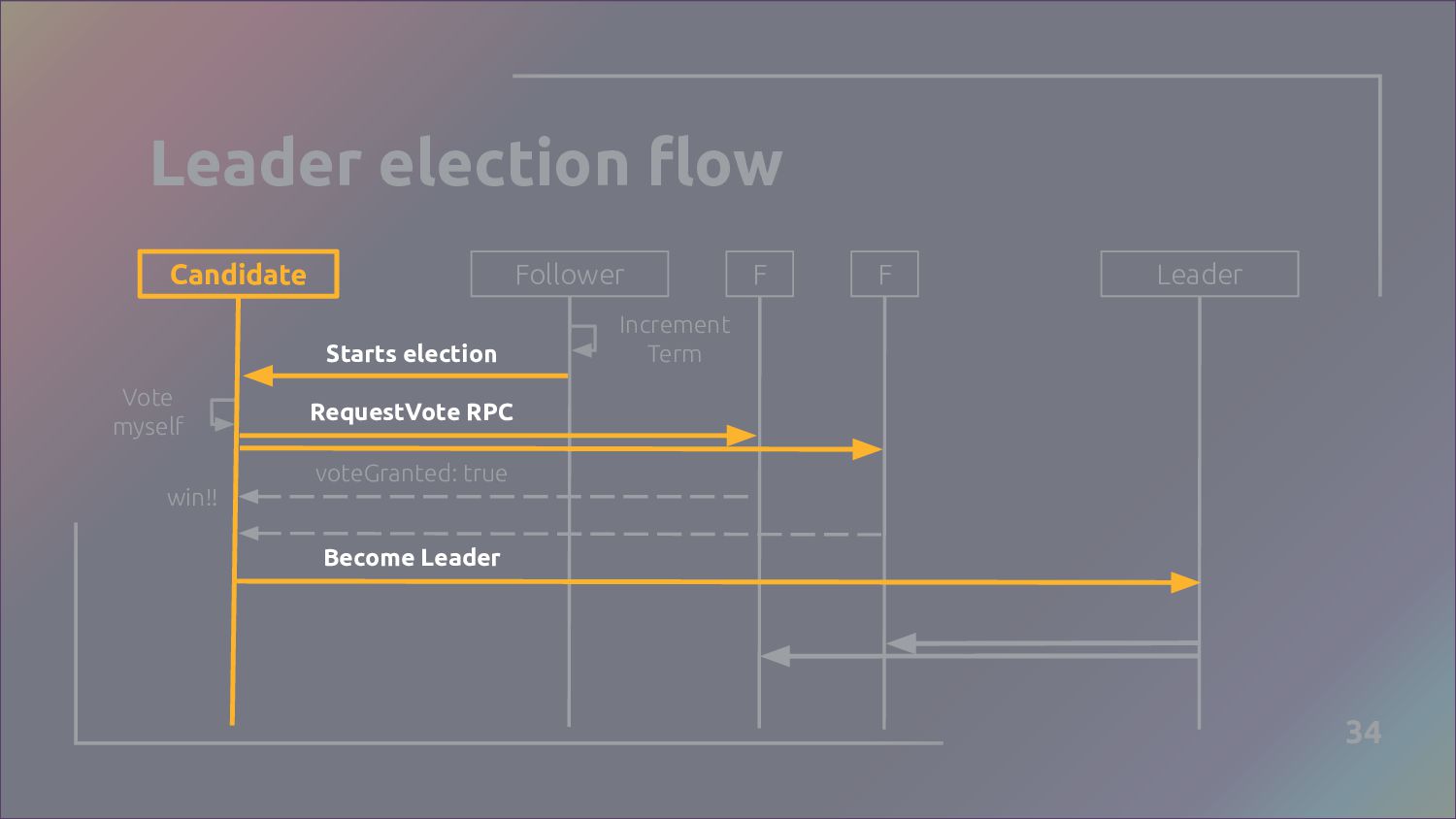 Leader election flow 33 Candidate Follower F F Leader RequestVote