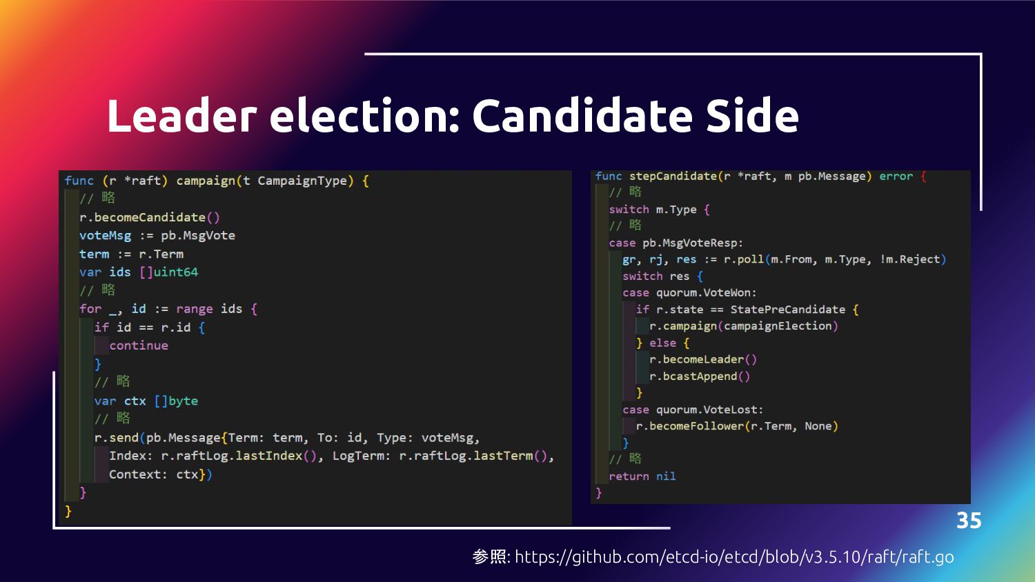 Leader election: Candidate Side 35 参照: https://github.com/etcd-io/etcd/blob/v3.5.10/raft/raft.go