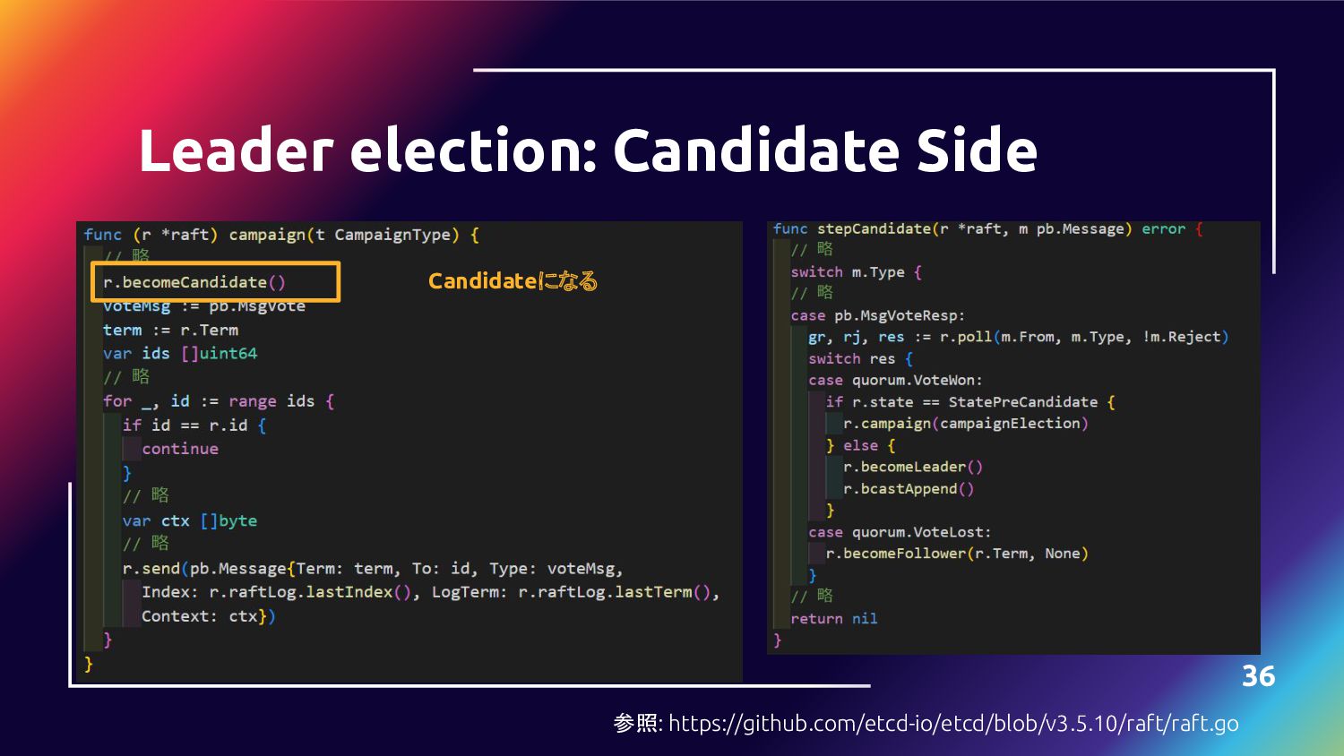 Leader election: Candidate Side 36 参照: https://github.com/etcd-io/etcd/blob/v3.5.10/raft/raft.go Candidateになる