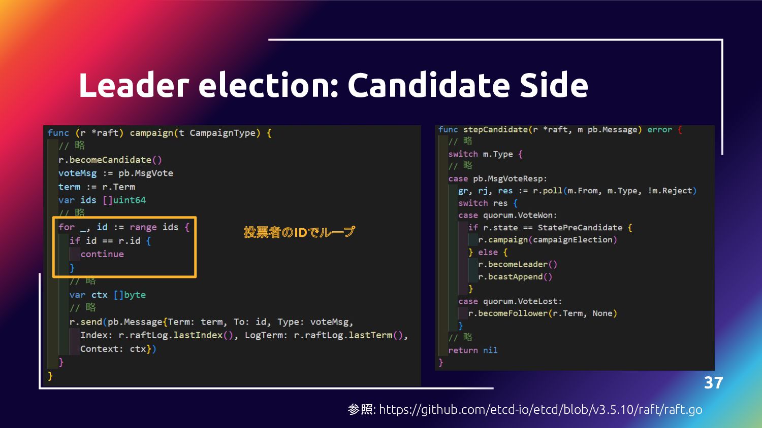 Leader election: Candidate Side 37 参照: https://github.com/etcd-io/etcd/blob/v3.5.10/raft/raft.go 投票者のIDでループ