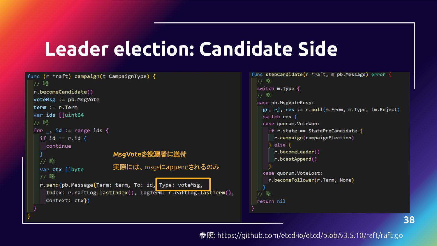 Leader election: Candidate Side 38 参照: https://github.com/etcd-io/etcd/blob/v3.5.10/raft/raft.go MsgVoteを投票者に送付 実際には、msgsにappendされるのみ
