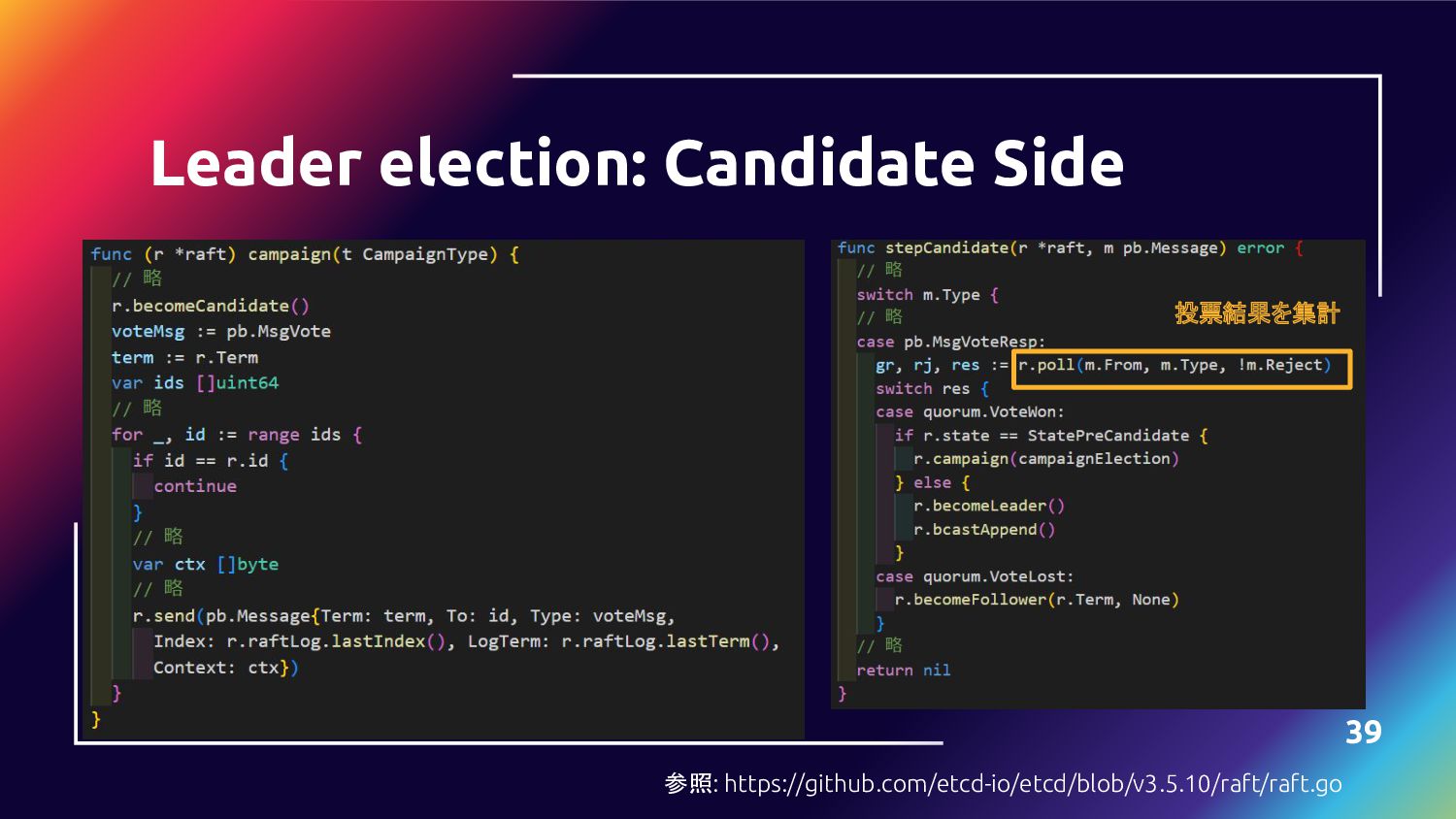 Leader election: Candidate Side 39 参照: https://github.com/etcd-io/etcd/blob/v3.5.10/raft/raft.go 投票結果を集計