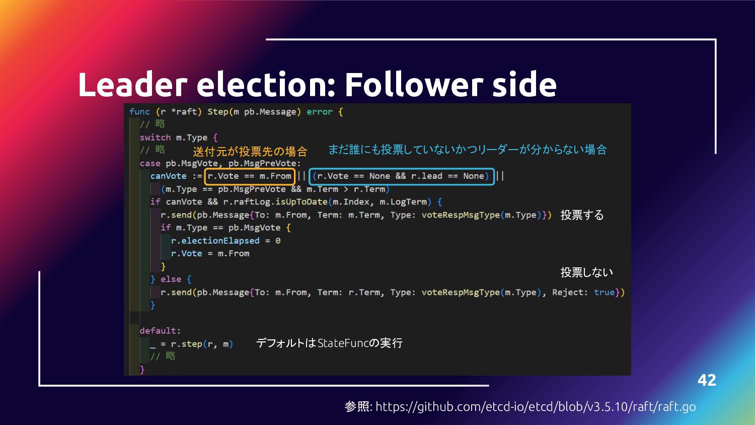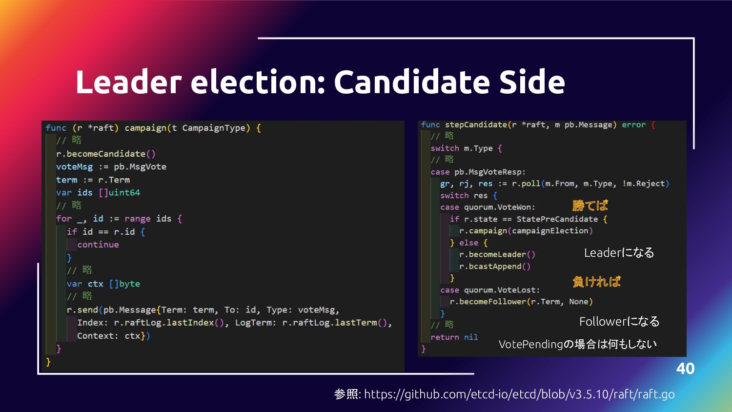 Leader election: Candidate Side 40 参照: https://github.com/etcd-io/etcd/blob/v3.5.10/raft/raft.go 勝てば 負ければ Followerになる