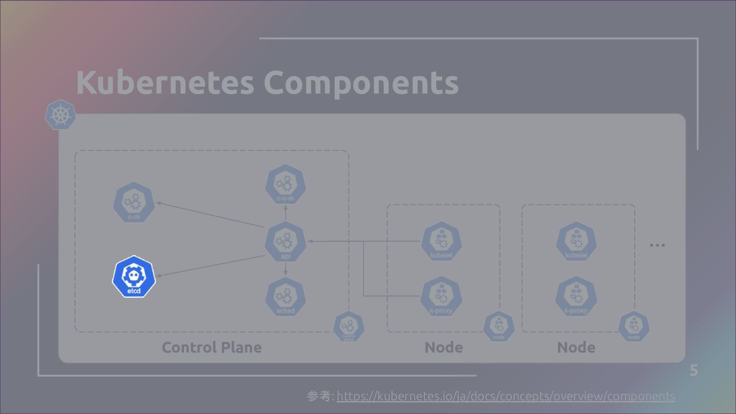 Kubernetes Components 4 … Control Plane Node Node 参考: https://kubernetes.io/ja/docs/concepts/overview/components