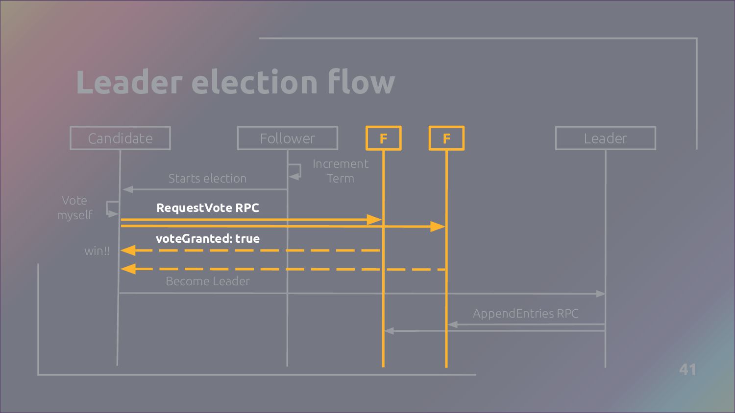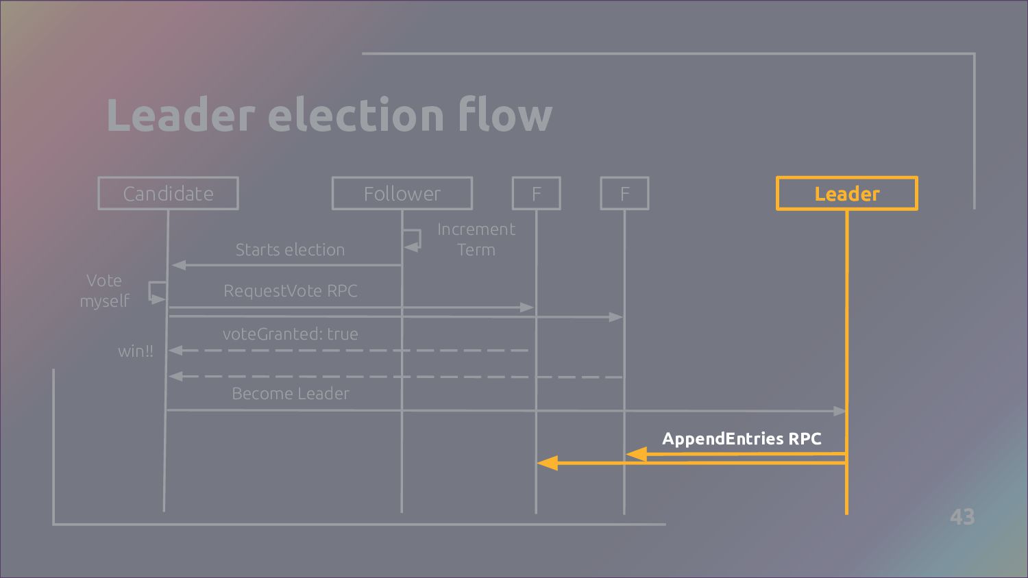 Leader election flow 43 Candidate Follower F F RequestVote RPC