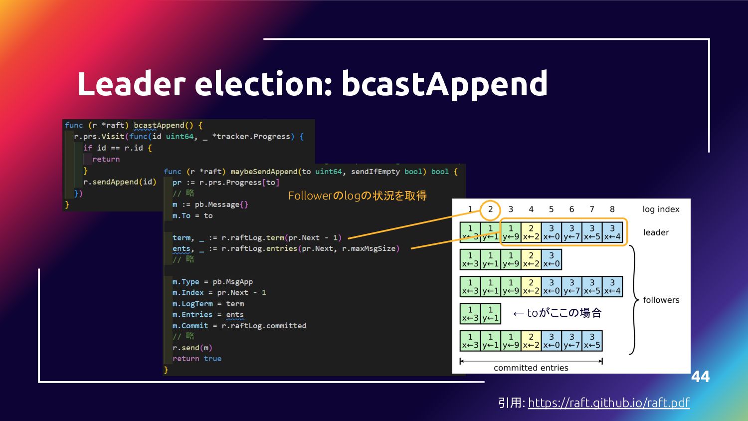 Leader election: bcastAppend 44 ← toがここの場合 Followerのlogの状況を取得 引用: https://raft.github.io/raft.pdf