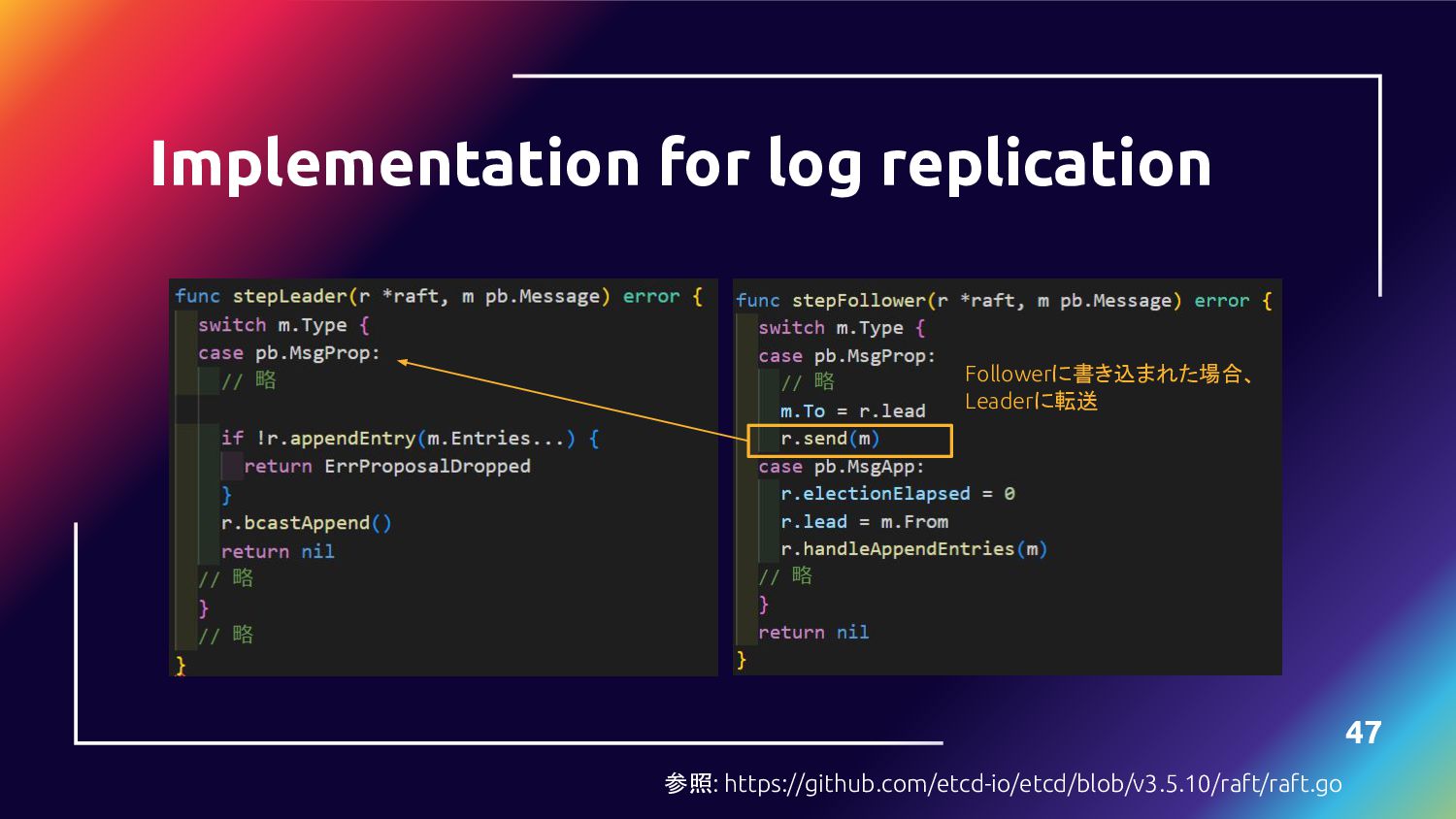 Implementation for log replication 47 参照: https://github.com/etcd-io/etcd/blob/v3.5.10/raft/raft.go Followerに書き込まれた場合、 Leaderに転送