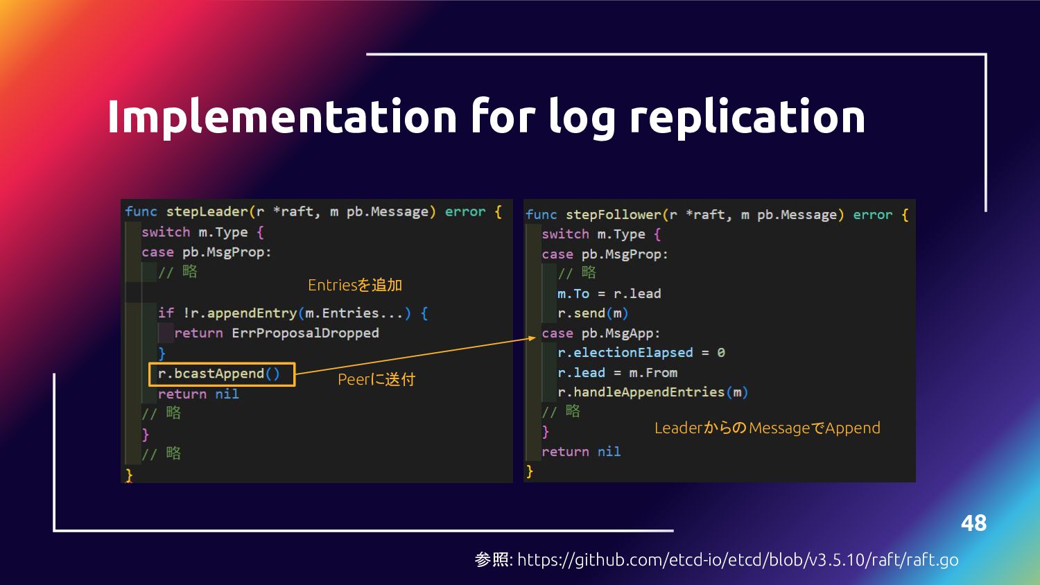 Implementation for log replication 48 参照: https://github.com/etcd-io/etcd/blob/v3.5.10/raft/raft.go Peerに送付 Entriesを追加 LeaderからのMessageでAppend