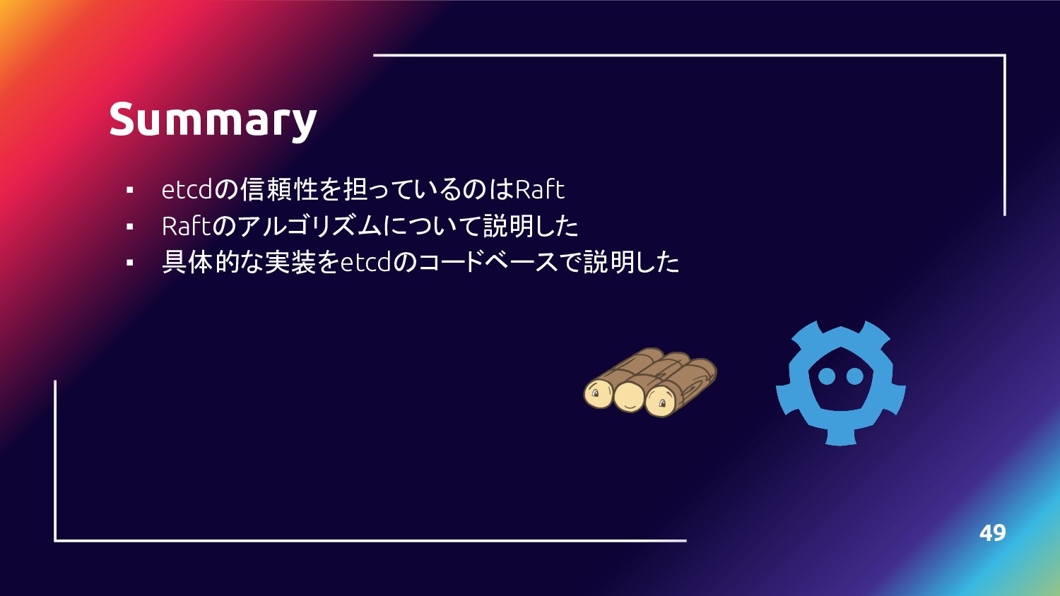 Summary 49 ▪ etcdの信頼性を担っているのはRaft ▪ Raftのアルゴリズムについて説明した ▪ 具体的な実装をetcdのコードベースで説明した
