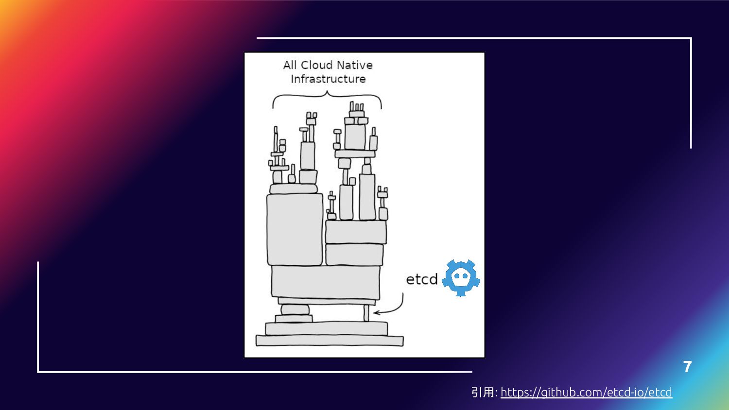 Secure - (optional)クライアント証明書認証による自動TLS ▫ Fast - 10,000 writes/secの書き込み ▫ Reliable - Raftを用いた適切な分散 ▪ Kubernetesでは全てのクラスター情報の保存場所として利用 6 参考: https://github.com/etcd-io/etcd