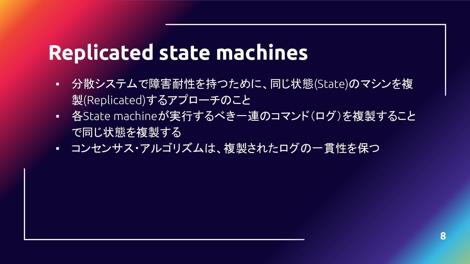 Replicated state machines 8 ▪ 分散システムで障害耐性を持つために、同じ状態(State)のマシンを複 製(Replicated)するアプローチのこと ▪ 各State machineが実行するべき一連のコマンド(ログ)を複製すること