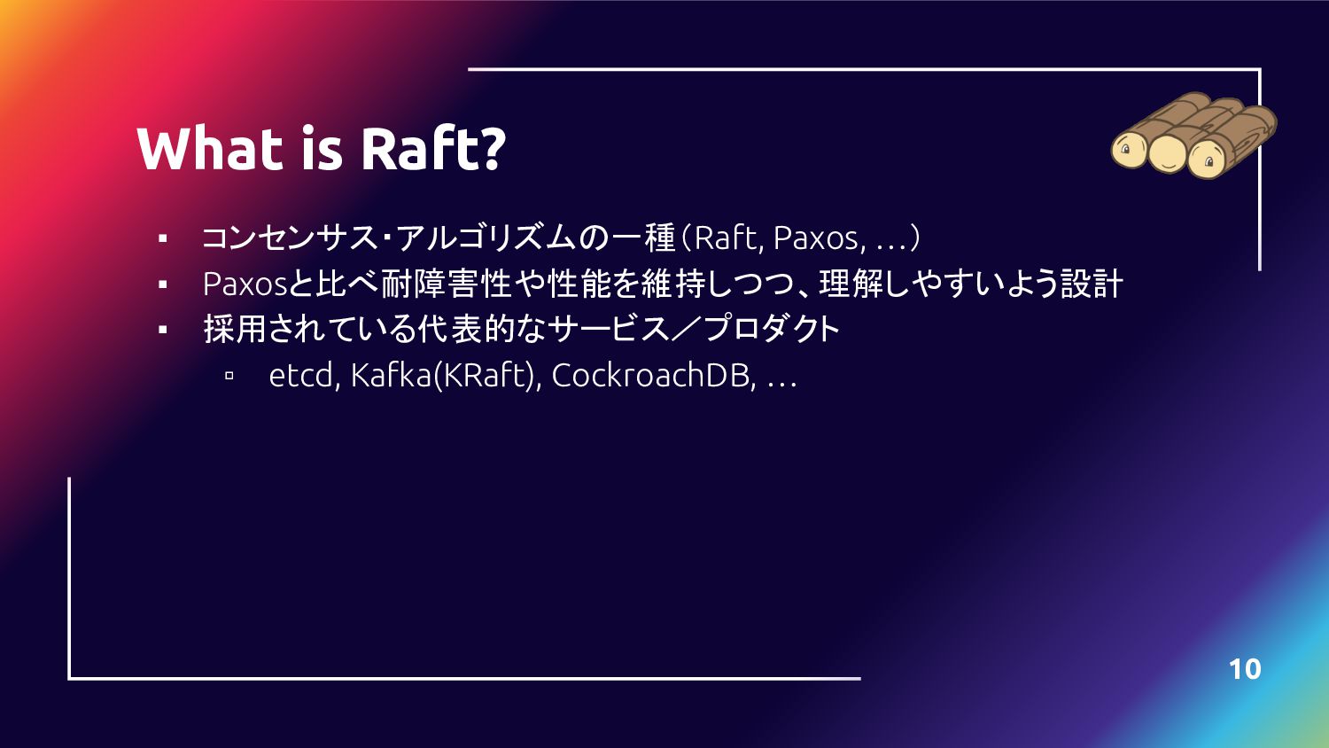 What is Raft? ▪ コンセンサス・アルゴリズムの一種(Raft, Paxos, …) ▪ Paxosと比べ耐障害性や性能を維持しつつ、理解しやすいよう設計 ▪