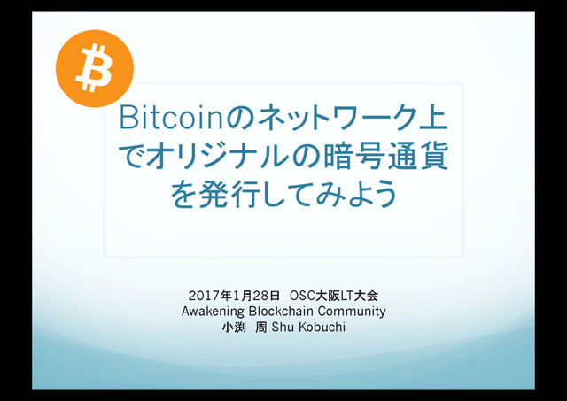 Bitcoinのネットワーク上 でオリジナルの暗号通貨 を発行してみよう 2017年1月28日 OSC大阪LT大会 Awakening Blockchain Community 小渕 周 Shu Kobuchi