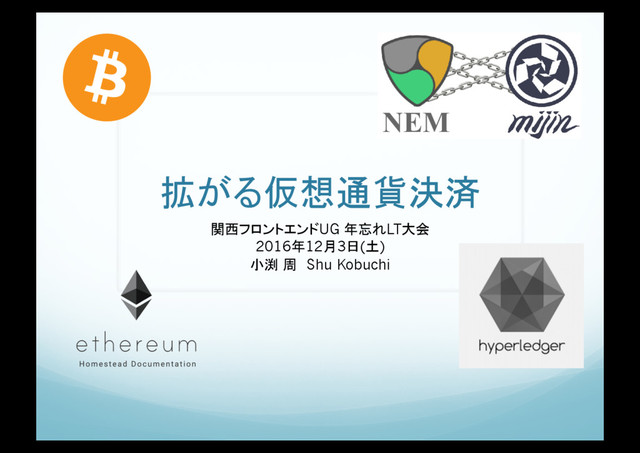 拡がる仮想通貨決済 関西フロントエンドUG 年忘れLT大会 2016年12月3日(土) 小渕 周 Shu Kobuchi