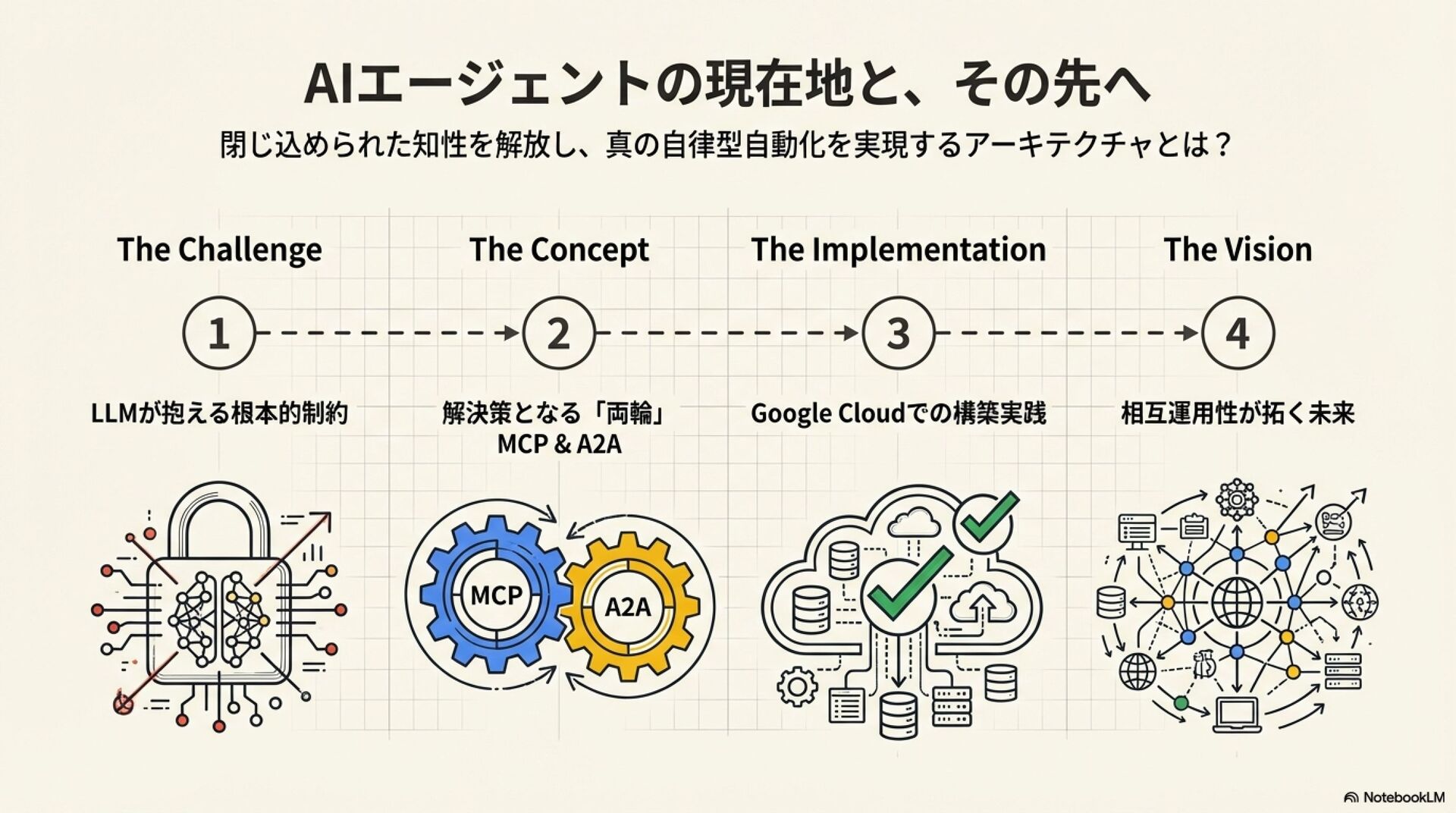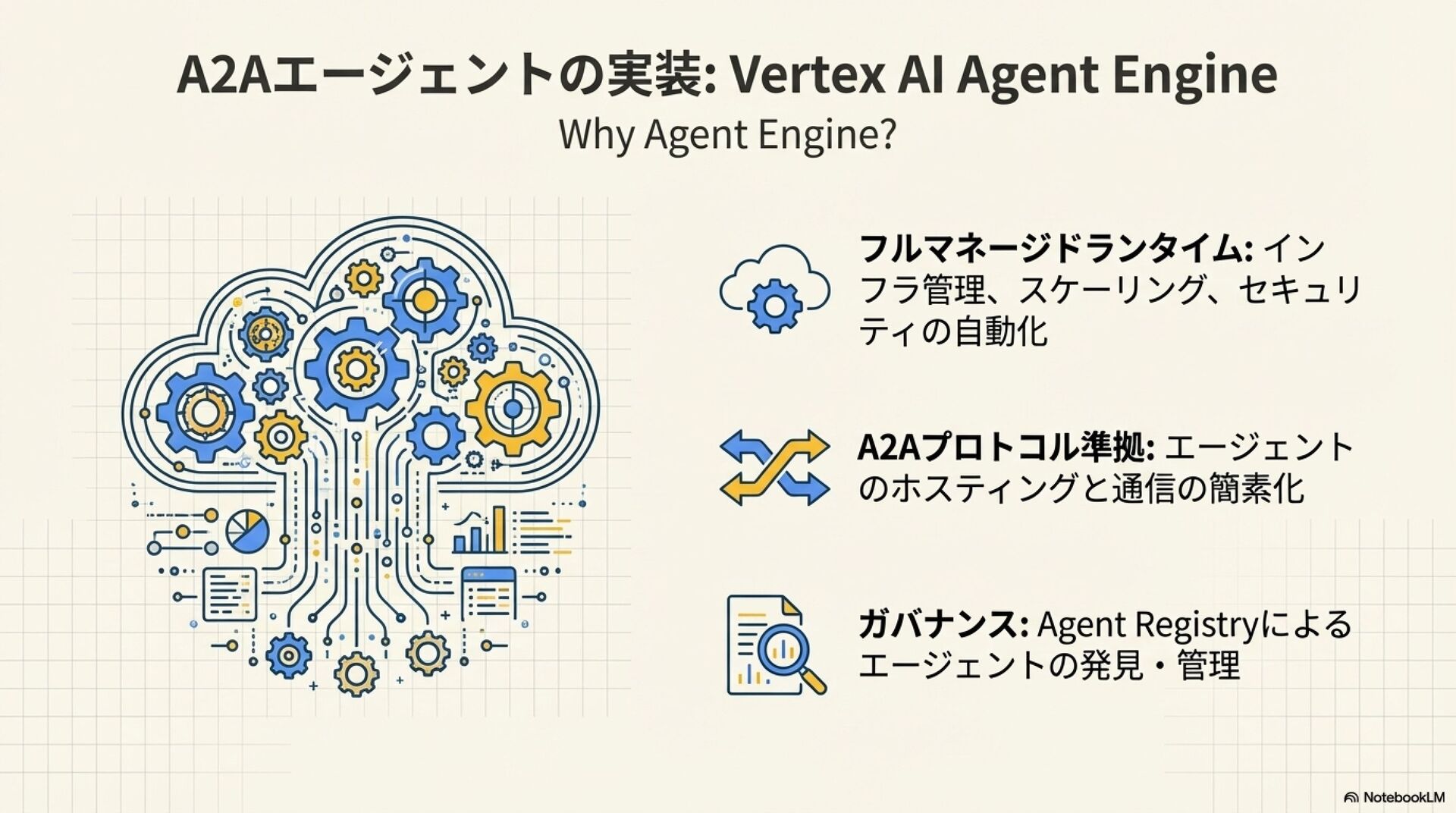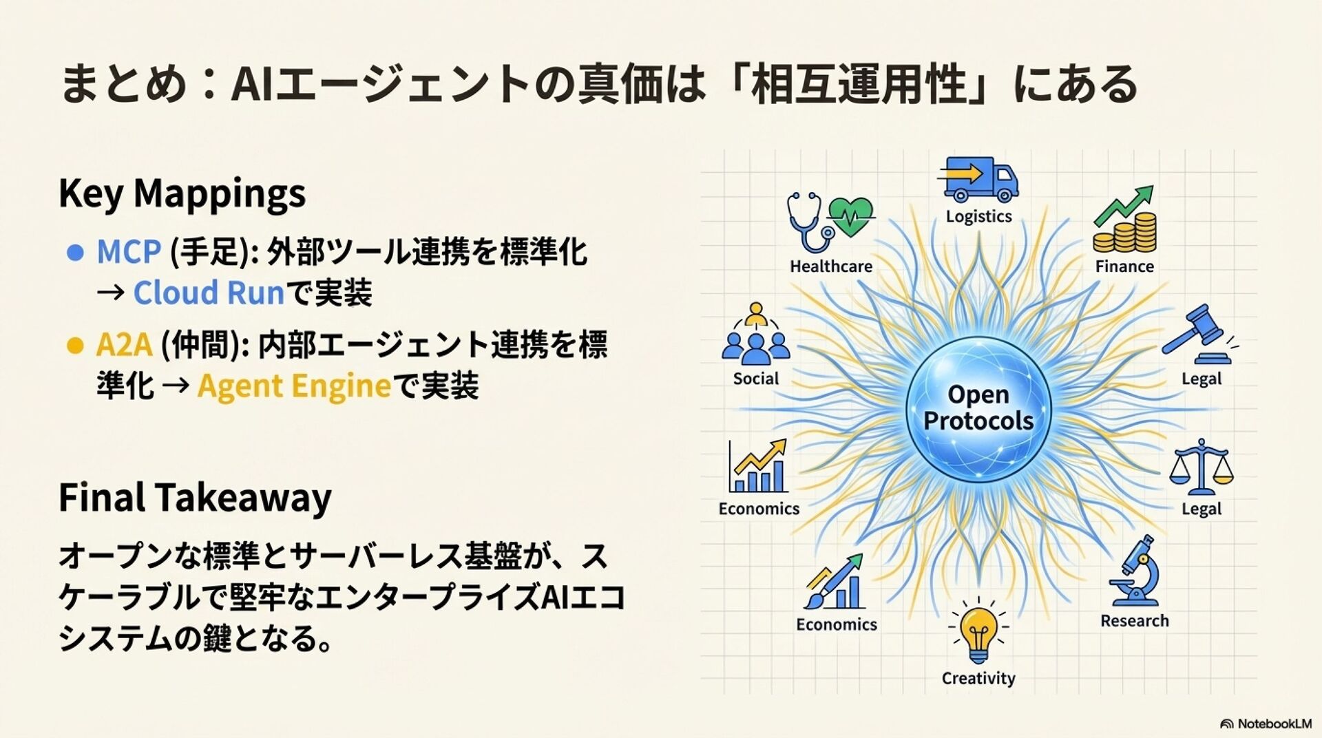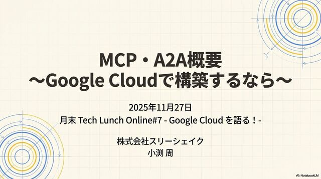 「Jagu'e'r 月末 Tech Lunch Online#7 - Google Cloud を語る!-」にて、 AIエージェントのMCPとA2Aの概要と、それらをGoogle Cloudで構築する上でのTipsを紹介させていただきました。 https://jaguer-tech-lunch.connpass.com/event/362363/