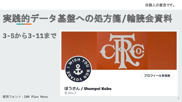 実践的データ基盤への処方箋/輪読会資料 3-5から3-11まで 使用フォント:IBM Plex Mono ※個人の意見です。 1