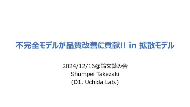 EDM2[1] (当時のSOTA) • Poor model • 学習時間の短縮 • モデルサイズの縮小 • 上記の両方 • 比較手法 • CFG • CFG + Guidance interval ImageNetの画像生成タスクにおける品質評価 10 ※ FDDINOv2についても評価し同様の結果 ※ 一部条件なしでの 実験もあり Baseline&比較手法より優れた精度 学習時間の短縮,モデルサイズの縮小 だけでもCFGより品質改善 (両方が最も良い) 条件なし (unconditional)の生成でも 品質が改善 [1] Karras+, CVPR2024 [2] Kynkäänniemi+, NeurIPS2024