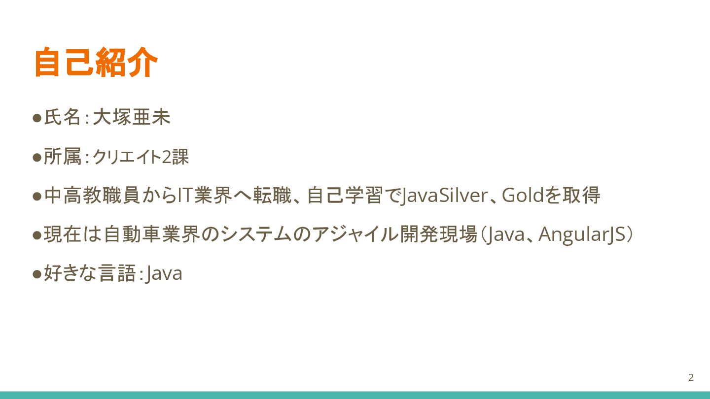 自己紹介 •氏名:大塚亜未 •所属:クリエイト2課 •中高教職員からIT業界へ転職、自己学習でJavaSilver、Goldを取得 •現在は自動車業界のシステムのアジャイル開発現場(Java、AngularJS) •好きな言語:Java 2