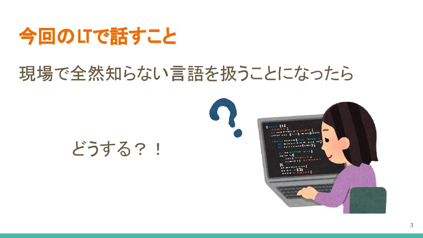 今回のLTで話すこと 現場で全然知らない言語を扱うことになったら 3 どうする?!