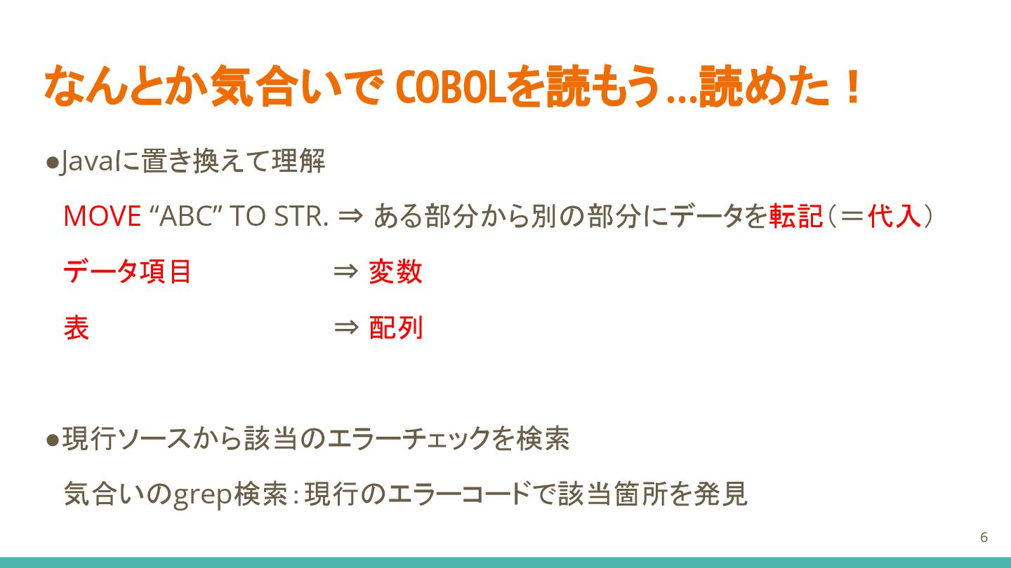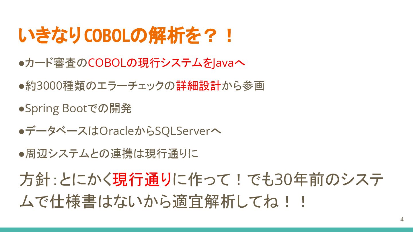 いきなりCOBOLの解析を?! •カード審査のCOBOLの現行システムをJavaへ •約3000種類のエラーチェックの詳細設計から参画 •Spring Bootでの開発 •データベースはOracleからSQLServerへ •周辺システムとの連携は現行通りに 4 方針:とにかく現行通りに作って!でも30年前のシステ ムで仕様書はないから適宜解析してね!!
