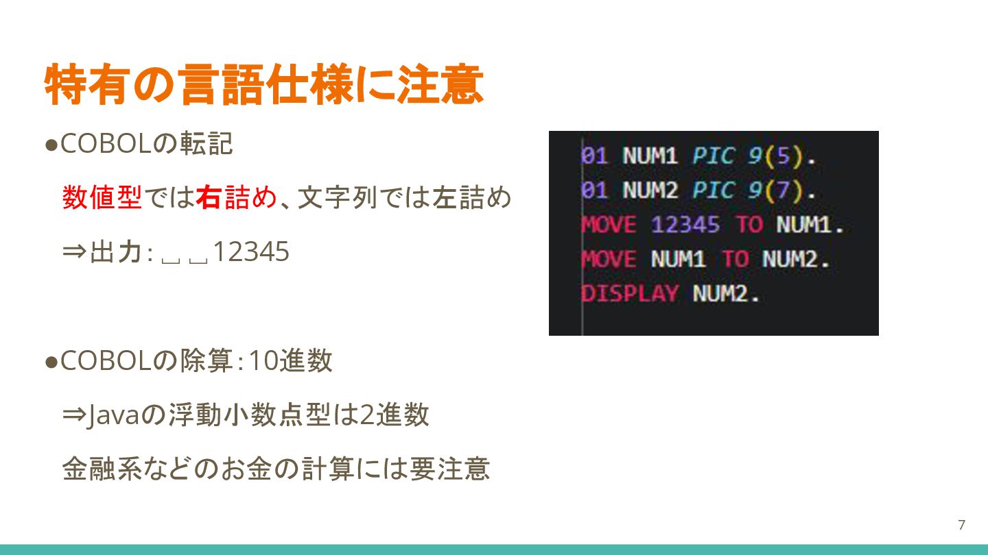 特有の言語仕様に注意 •COBOLの転記 数値型では右詰め、文字列では左詰め ⇒出力:␣␣12345 •COBOLの除算:10進数 ⇒Javaの浮動小数点型は2進数 金融系などのお金の計算には要注意 7