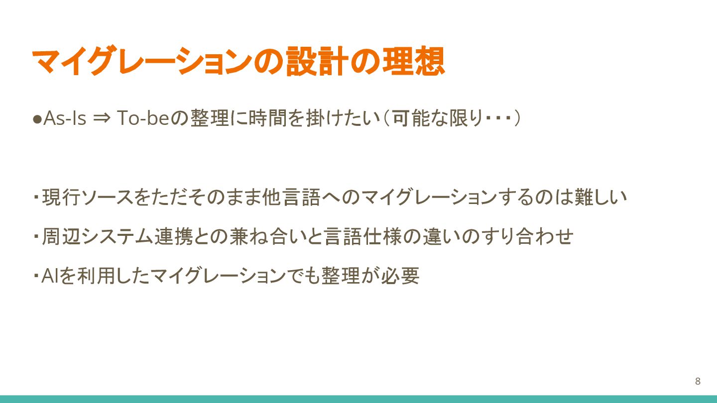 マイグレーションの設計の理想 •As-Is ⇒ To-beの整理に時間を掛けたい(可能な限り・・・) ・現行ソースをただそのまま他言語へのマイグレーションするのは難しい ・周辺システム連携との兼ね合いと言語仕様の違いのすり合わせ ・AIを利用したマイグレーションでも整理が必要 8