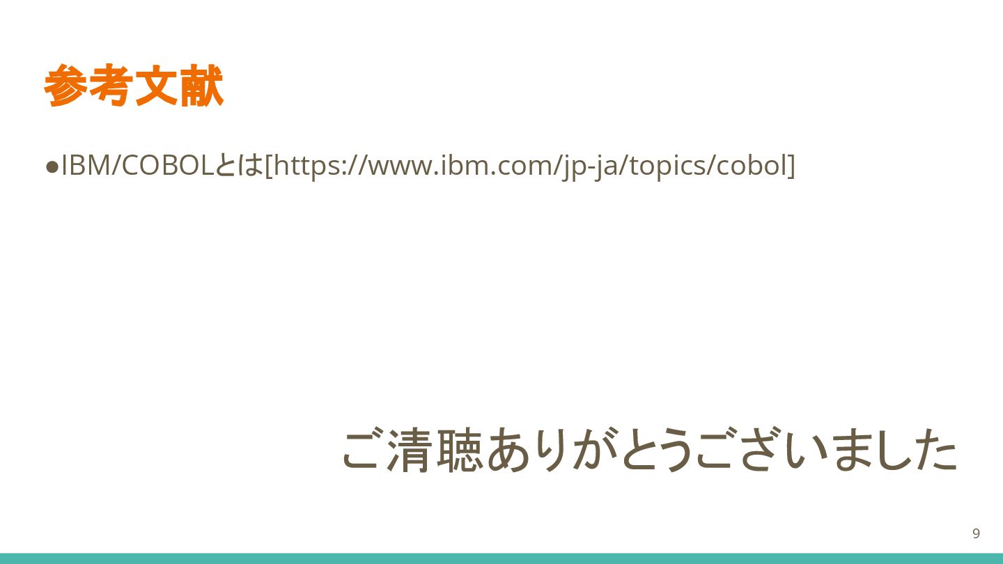 参考文献 •IBM/COBOLとは[https://www.ibm.com/jp-ja/topics/cobol] 9 ご清聴ありがとうございました