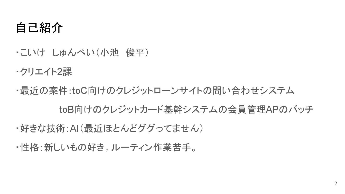 自己紹介 ・こいけ しゅんぺい(小池 俊平) ・クリエイト2課 ・最近の案件:toC向けのクレジットローンサイトの問い合わせシステム toB向けのクレジットカード基幹システムの会員管理APのバッチ ・好きな技術:AI(最近ほとんどググってません) ・性格:新しいもの好き。ルーティン作業苦手。 2