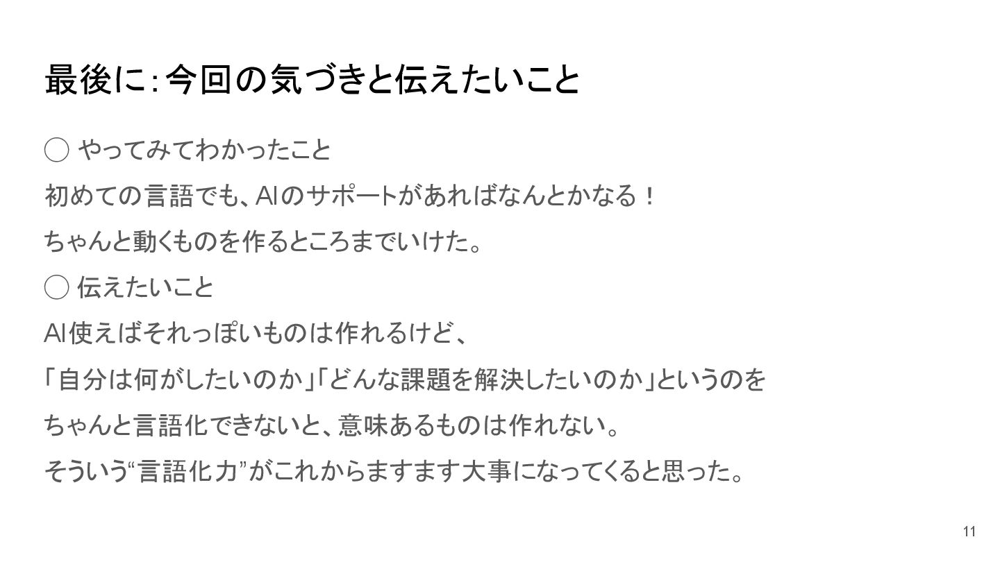 最後に:今回の気づきと伝えたいこと ◯ やってみてわかったこと 初めての言語でも、AIのサポートがあればなんとかなる! ちゃんと動くものを作るところまでいけた。 ◯ 伝えたいこと AI使えばそれっぽいものは作れるけど、 「自分は何がしたいのか」「どんな課題を解決したいのか」というのを ちゃんと言語化できないと、意味あるものは作れない。