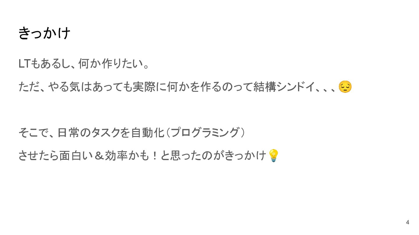 きっかけ LTもあるし、何か作りたい。 ただ、やる気はあっても実際に何かを作るのって結構シンドイ、、、😔 そこで、日常のタスクを自動化(プログラミング) させたら面白い&効率かも!と思ったのがきっかけ💡 4