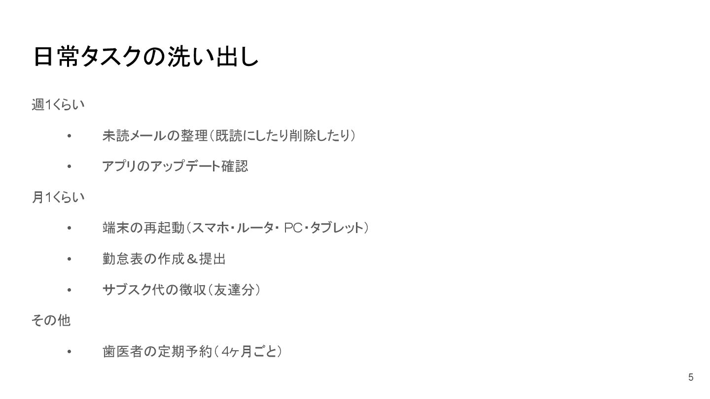 日常タスクの洗い出し 週1くらい • 未読メールの整理(既読にしたり削除したり) • アプリのアップデート確認 月1くらい • 端末の再起動(スマホ・ルータ・ PC・タブレット)
