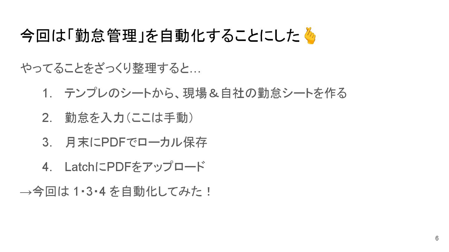 今回は「勤怠管理」を自動化することにした🫰 やってることをざっくり整理すると… 1. テンプレのシートから、現場&自社の勤怠シートを作る 2. 勤怠を入力(ここは手動) 3. 月末にPDFでローカル保存 4. LatchにPDFをアップロード