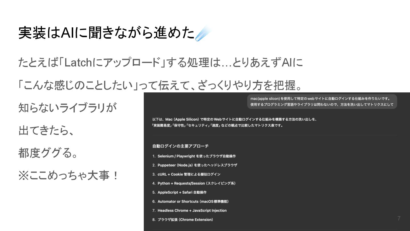 実装はAIに聞きながら進めた☄ たとえば「Latchにアップロード」する処理は…とりあえずAIに 「こんな感じのことしたい」って伝えて、ざっくりやり方を把握。 知らないライブラリが 出てきたら、 都度ググる。 ※ここめっちゃ大事! 7