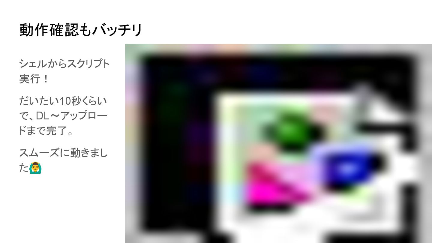 動作確認もバッチリ シェルからスクリプト 実行! だいたい10秒くらい で、DL〜アップロー ドまで完了。 スムーズに動きまし た 9