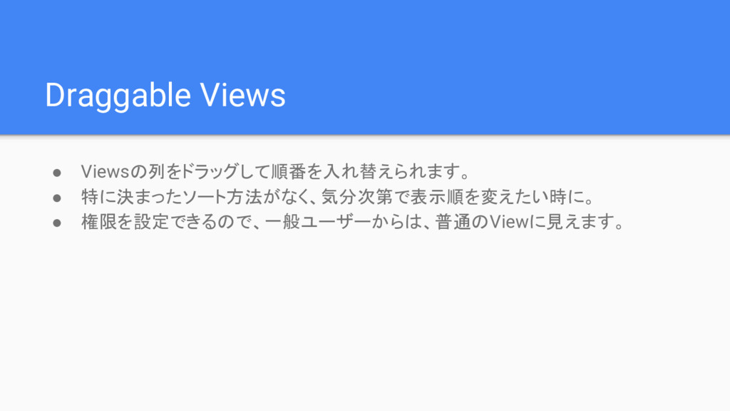 Draggable Views • Viewsの列をドラッグして順番を入れ替えられます。 • 特に決まったソート方法がなく、気分次第で表示順を変えたい時に。 • 権限を設定できるので、一般ユーザーからは、普通のViewに見えます。
